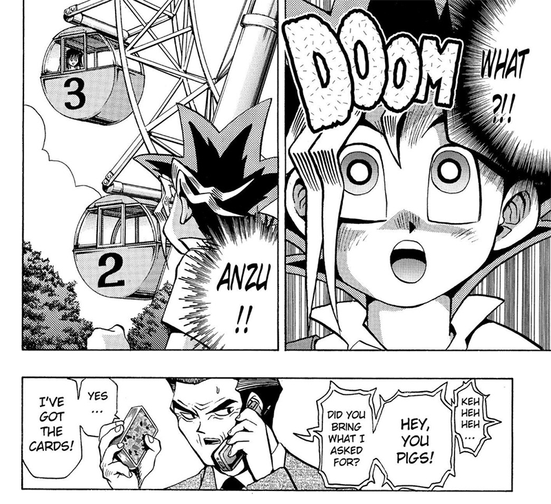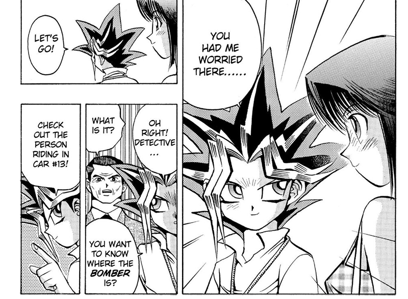 The Security and Police gives the warning to the visitors about them receiving a Bomber threat...Anzu getting desperate and irresponsible ideas in commenting to find this situation exciting, Yugi for once is the alerted and responsible one π, she uses the run stampede to make Yugi lose her, going to the ferris wheel, making Yugi notice her to get him anxious so it would increase the chances of Dark Yugi appearing where the Police warn and to be considered a danger zone...she is being smart and stupid at the same time...how is that possible? It's when someone is getting desperate...one of my biggest bother is that she is also making Yugi worry and anxious on purpose while knowing Yugi has feelings for her and making all this so she can see the "other yugi", I remember after reading this chapter for the first time, it took so long to come to like her character, it took re-reads and this analysis project.
